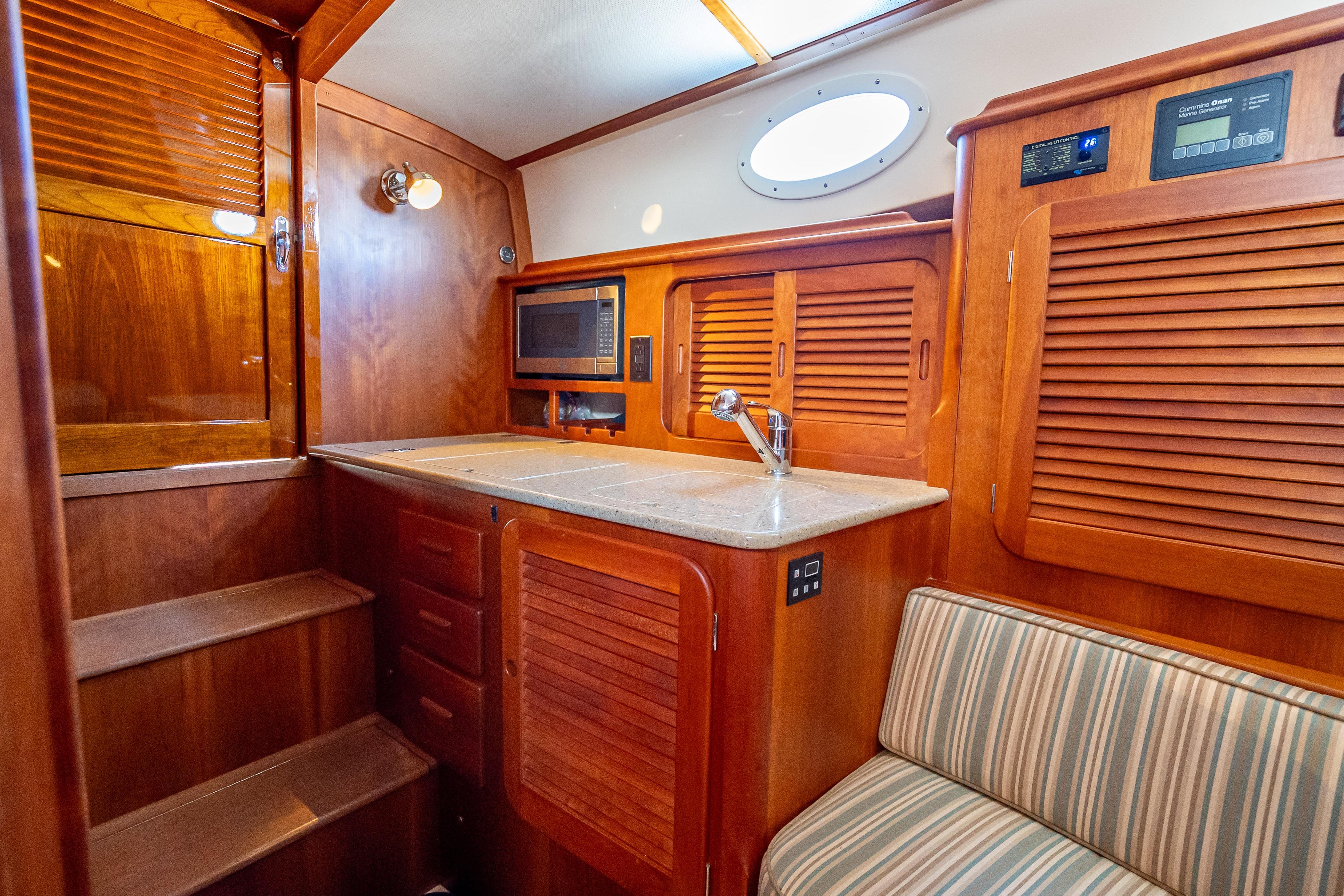 - Cockpit/pilothouse lockers with varnished louvered teak doors